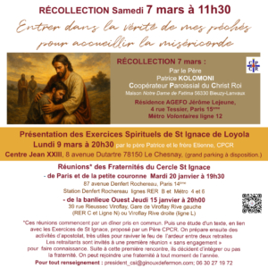 A l’école de saint Ignace, les C.P.C.R. (Coopératrices paroissiales du Christ-Roi) vous proposent un itinéraire spirituel de 5 jours, qui sous l’inspiration de l’Esprit-Saint, rend ce parcours riche en grâces.