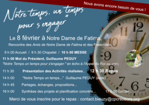 Dates Ex. St Ignace Prier avec les CPCR Feuilles de route Témoignages Journal de M Julien 8 février 2026 à Notre Dame de Fatima. Cette journée est pour vous !